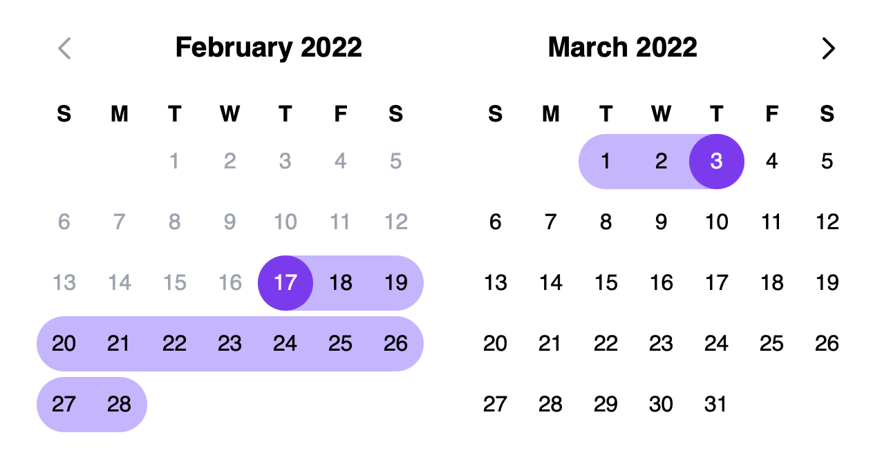 - Flexible – Display one or more months at once, or a custom time range for use cases like a week view. Minimum and maximum values, unavailable dates, and non-contiguous selections are supported as well.