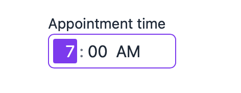 A time field consists of a label, and a group of segments representing each unit of a time (e.g. hours, minutes, and seconds). Each segment is individually focusable and editable by the user, by typing or using the arrow keys to increment and decrement the value. This approach allows values to be formatted and parsed correctly regardless of the locale or time format, and offers an easy and error-free way to edit times using the keyboard.
